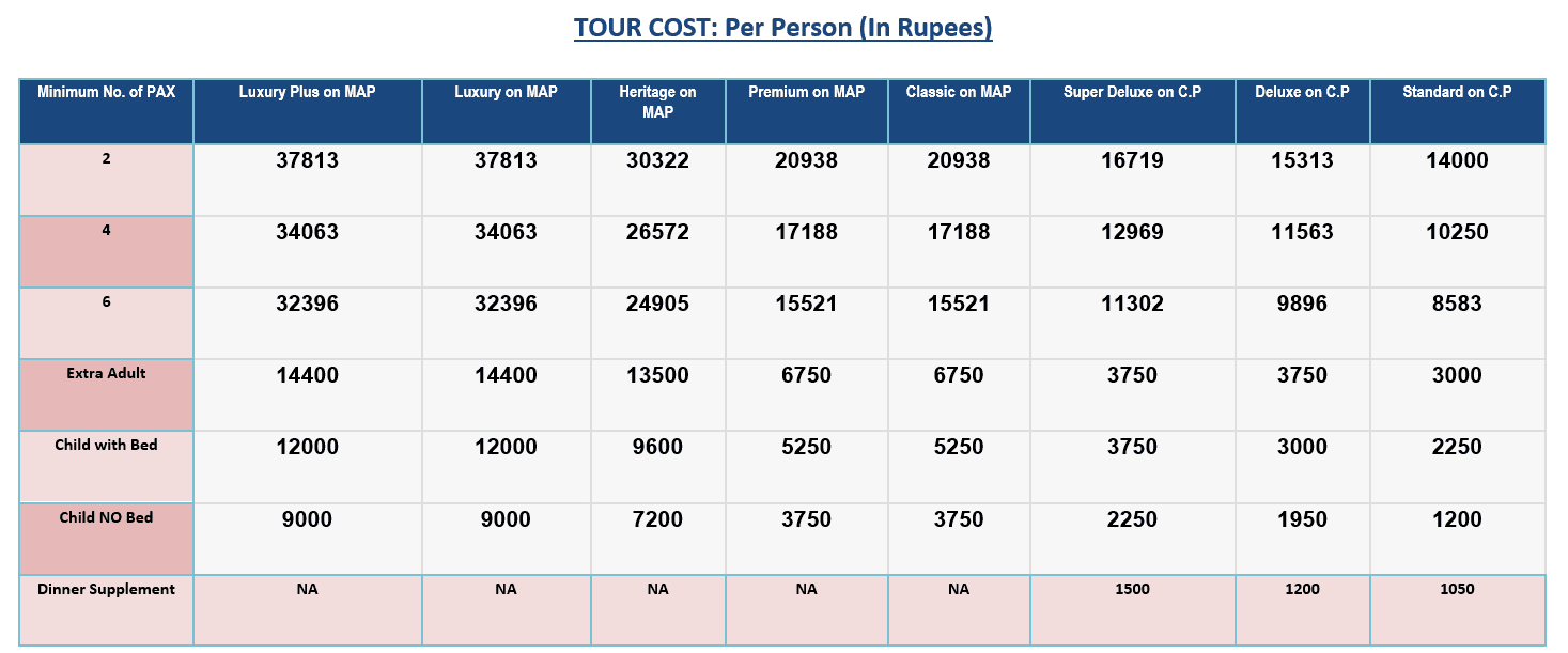 Minimum No. of PAX | Luxury Plus on MAP | Luxury on MAP | Heritage on MAP | Premium on MAP | Classic on MAP | Super Deluxe on C.P | Deluxe on C.P | Standard on C.P |