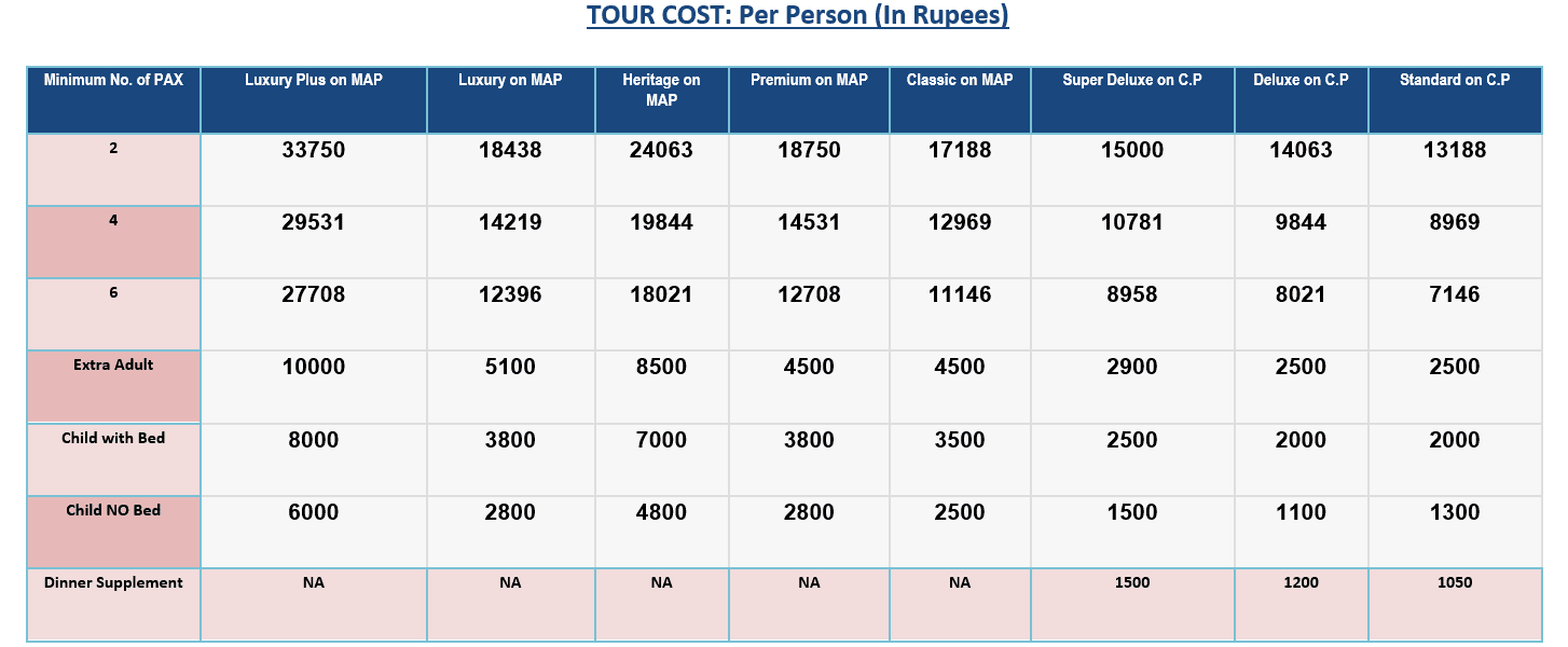 Minimum No. of PAX | Luxury Plus on MAP | Luxury on MAP | Heritage on MAP | Premium on MAP | Classic on MAP | Super Deluxe on C.P | Deluxe on C.P | Standard on C.P |