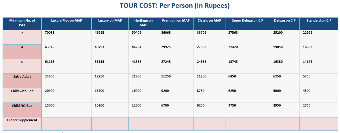 Minimum No. of PAX | Luxury Plus on MAP | Luxury on MAP | Heritage on MAP | Premium on MAP | Classic on MAP | Super Deluxe on C.P | Deluxe on C.P | Standard on C.P |