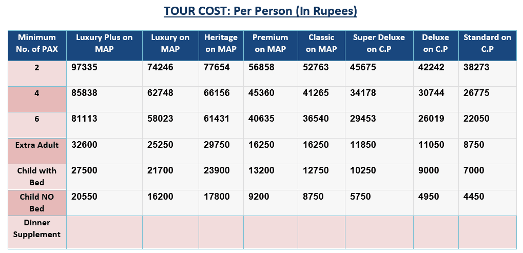 Minimum No. of PAX | Luxury Plus on MAP | Luxury on MAP | Heritage on MAP | Premium on MAP | Classic on MAP | Super Deluxe on C.P | Deluxe on C.P | Standard on C.P |