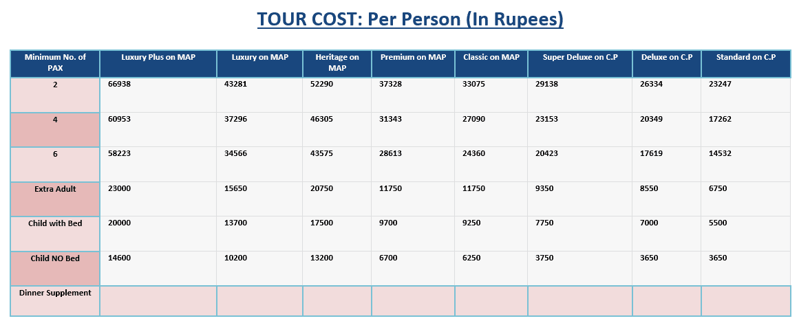 Minimum No. of PAX | Luxury Plus on MAP | Luxury on MAP | Heritage on MAP | Premium on MAP | Classic on MAP | Super Deluxe on C.P | Deluxe on C.P | Standard on C.P |