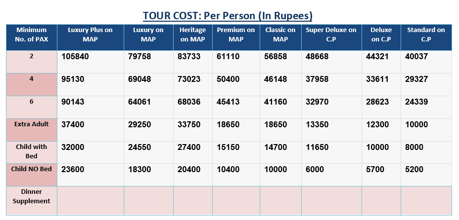 Minimum No. of PAX | Luxury Plus on MAP | Luxury on MAP | Heritage on MAP | Premium on MAP | Classic on MAP | Super Deluxe on C.P | Deluxe on C.P | Standard on C.P |