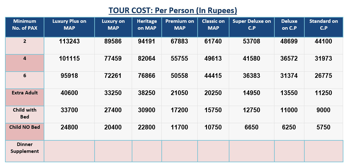 • Operator reserves the right to re-arrange itinerary to suit hotel availability without changing the total number of days in each destination and without compromising any services.