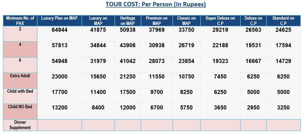 Minimum No. of PAX | Luxury Plus on MAP | Luxury on MAP | Heritage on MAP | Premium on MAP | Classic on MAP | Super Deluxe on C.P | Deluxe on C.P | Standard on C.P |