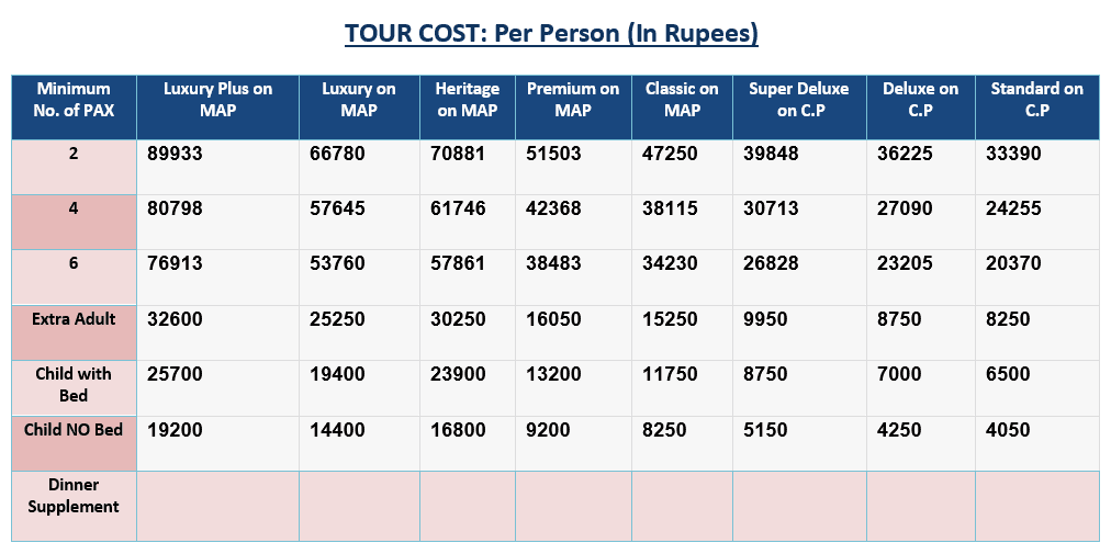 Minimum No. of PAX | Luxury Plus on MAP | Luxury on MAP | Heritage on MAP | Premium on MAP | Classic on MAP | Super Deluxe on C.P | Deluxe on C.P | Standard on C.P |