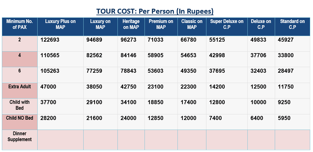 Minimum No. of PAX | Luxury Plus on MAP | Luxury on MAP | Heritage on MAP | Premium on MAP | Classic on MAP | Super Deluxe on C.P | Deluxe on C.P | Standard on C.P |