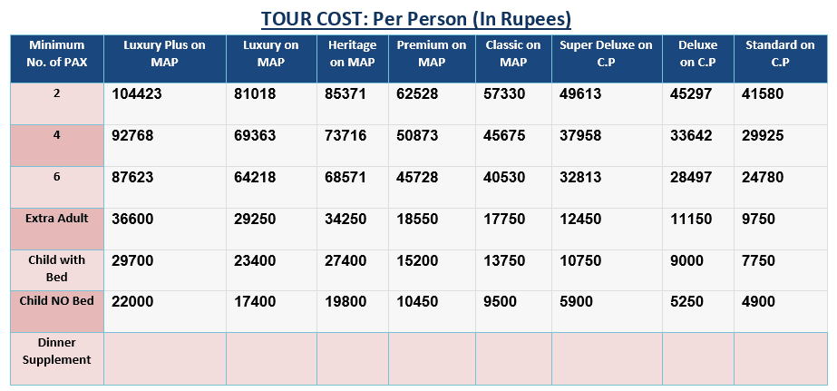 Minimum No. of PAX | Luxury Plus on MAP | Luxury on MAP | Heritage on MAP | Premium on MAP | Classic on MAP | Super Deluxe on C.P | Deluxe on C.P | Standard on C.P |
