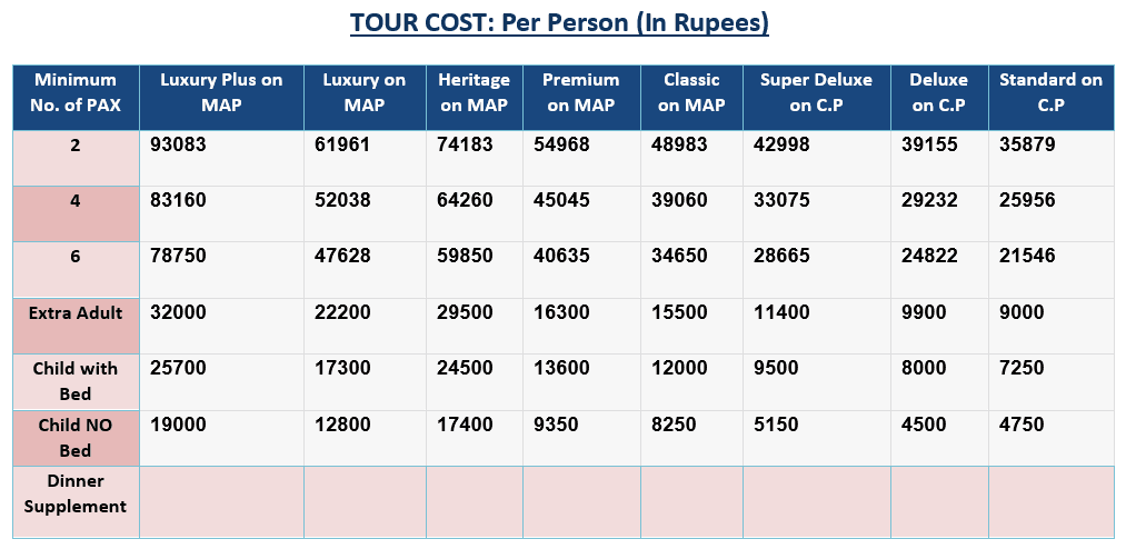 Minimum No. of PAX | Luxury Plus on MAP | Luxury on MAP | Heritage on MAP | Premium on MAP | Classic on MAP | Super Deluxe on C.P | Deluxe on C.P | Standard on C.P |