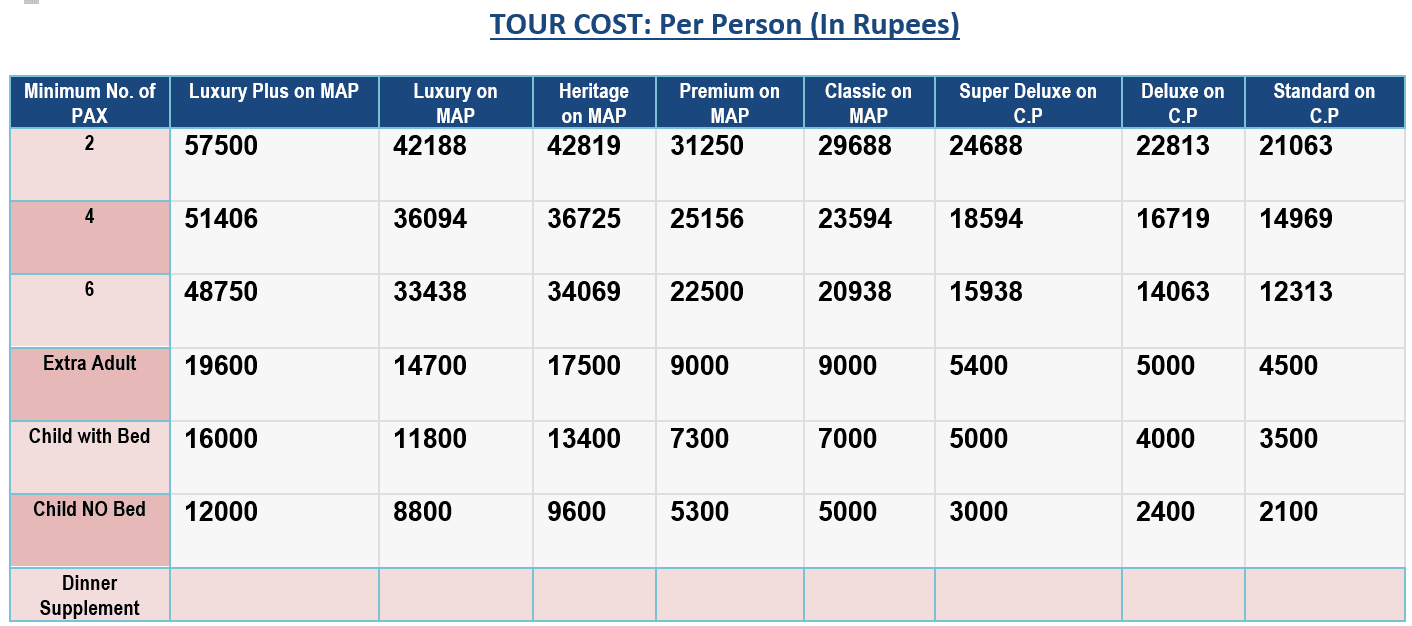 Minimum No. of PAX | Luxury Plus on MAP | Luxury on MAP | Heritage on MAP | Premium on MAP | Classic on MAP | Super Deluxe on C.P | Deluxe on C.P | Standard on C.P |