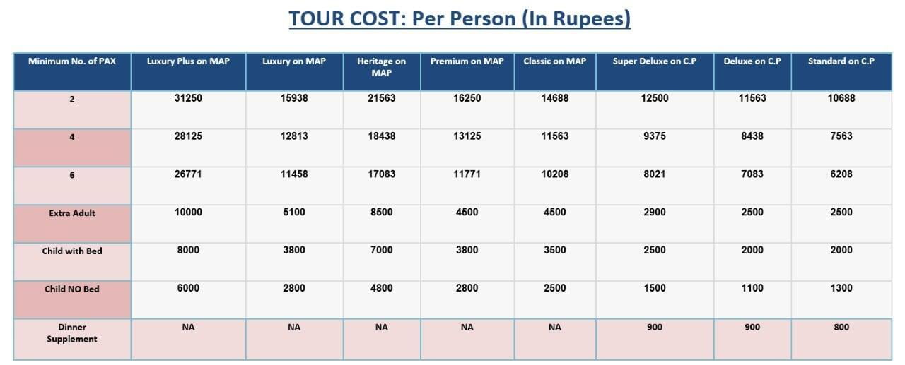 Minimum No. of PAX | Luxury Plus on MAP | Luxury on MAP | Heritage on MAP | Premium on MAP | Classic on MAP | Super Deluxe on C.P | Deluxe on C.P | Standard on C.P |
