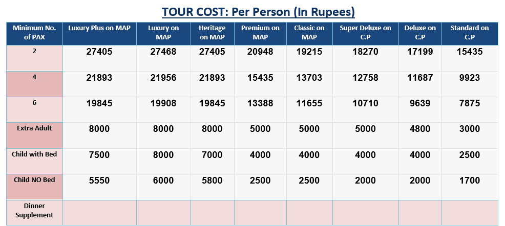 Minimum No. of PAX | Luxury Plus on MAP | Luxury on MAP | Heritage on MAP | Premium on MAP | Classic on MAP | Super Deluxe on C.P | Deluxe on C.P | Standard on C.P |