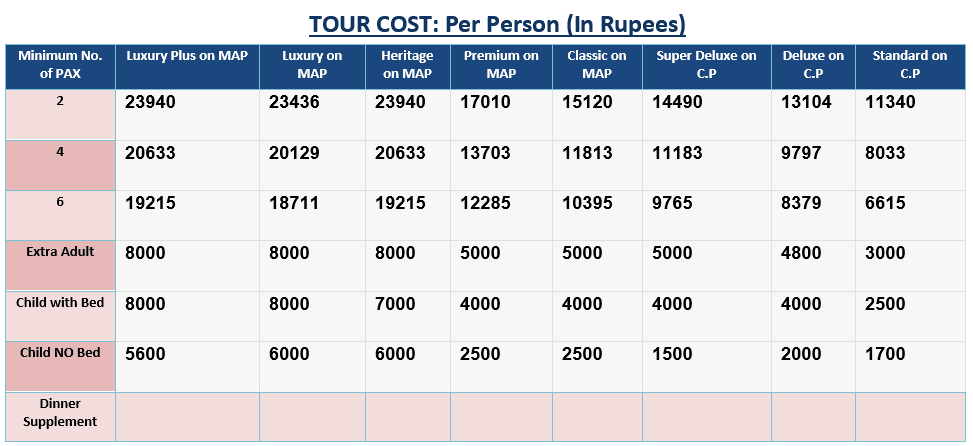Minimum No. of PAX | Luxury Plus on MAP | Luxury on MAP | Heritage on MAP | Premium on MAP | Classic on MAP | Super Deluxe on C.P | Deluxe on C.P | Standard on C.P |