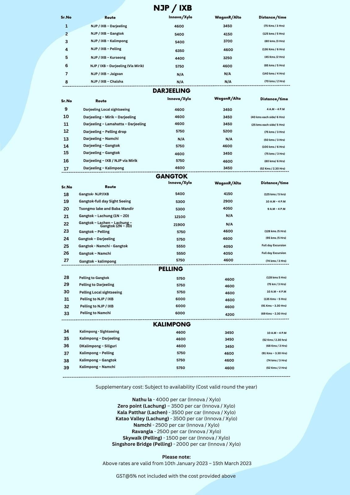 18 | Gangtok-NJP/IXB | 5400 | 4150 | (125kms/5hrs) |